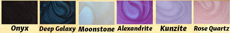 Onyx, Deep Galaxy, Moonstone, Alexandrite, Kunzite, Rose Quartz.